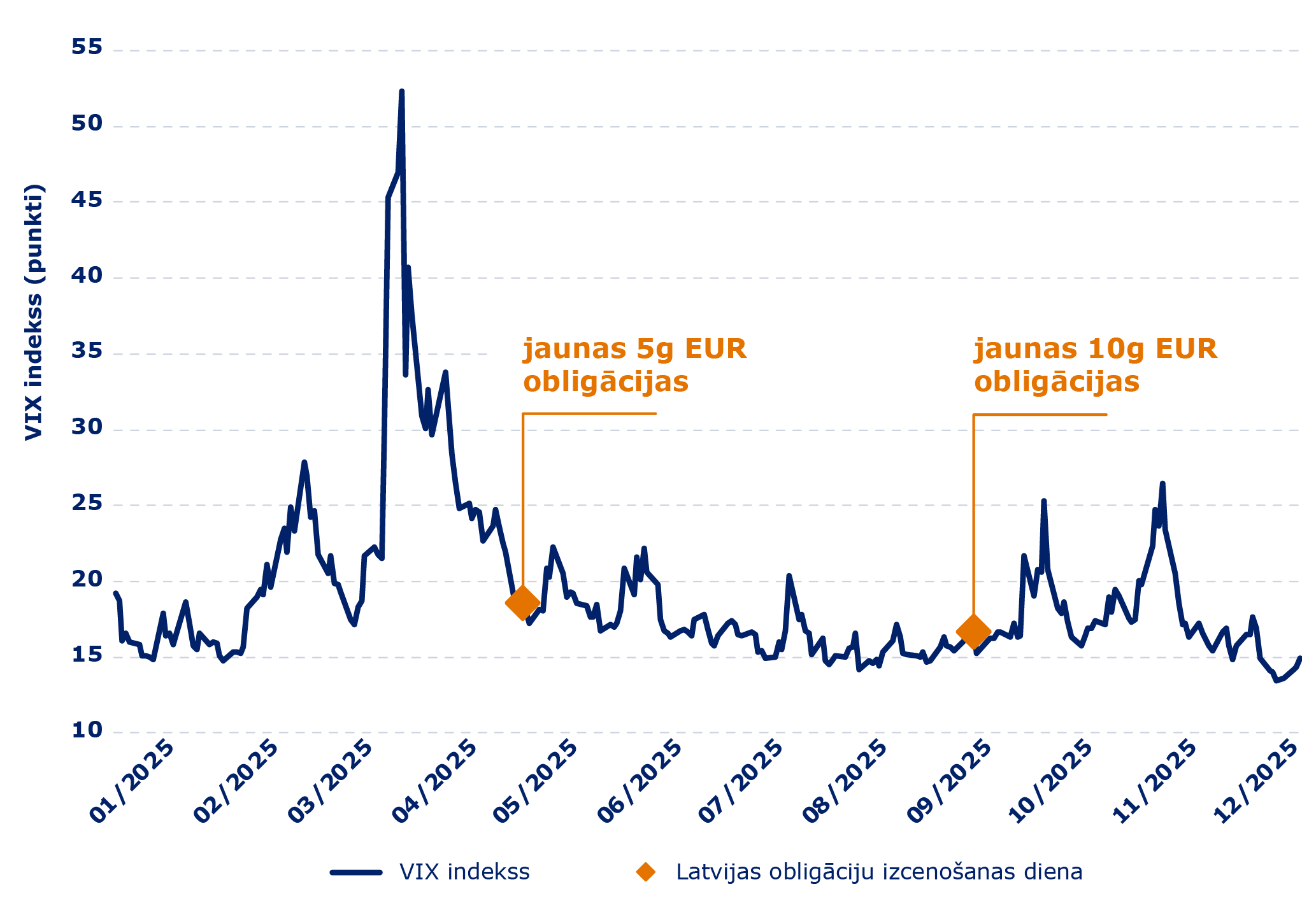 Katru gadu finanšu tirgos paaugstinātu svārstīgumu un nenoteiktību uztur jauni izaicinājumi un faktori. 2025. gadā finanšu tirgi pievērsa īpašu uzmanību ģeopolitiskajai spriedzei un reģionālajiem konfliktiem, “tarifu kaujām”, globālo ekonomiku spējai saglabāt izaugsmi un valstu fiskālās politikas ilgtspējai pieaugošo aizsardzības izdevumu apstākļos. Lai piesaistītu nepieciešamos resursus ar iespējami zemākām likmēm, Valsts kases darbība aizņēmumu vadības jomā ir vērsta uz aizņēmumu veikšanai labvēlīgu, relatīvi mierīgu brīžu izmantošanu, izvairoties no paaugstināta svārstīguma periodiem finanšu tirgos, kas novērš investoru uzmanību un samazina gatavību investēt vērtspapīros.