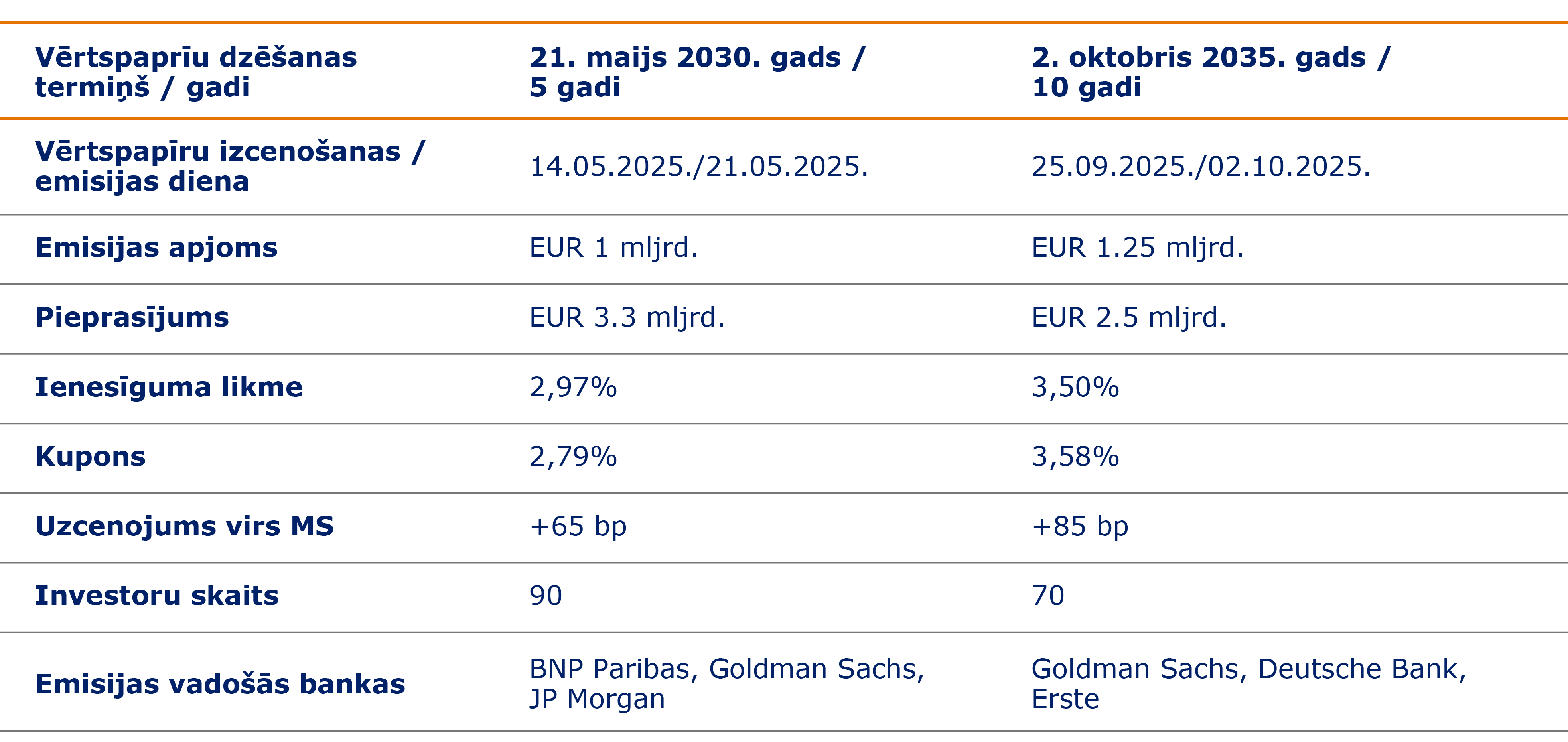 2025.gadā aizņemšanās EUR tirgū organizēta gada pimajā un otrajā pusgadā. Maijā emitētas 7 gadu obligācijas 1,0 mljrd. EUR apmērā un septembrī emitētas 10 gadu obligācijas 1,25 mljrd. EUR apmērā. Tā kā obligāciju termiņi atbilda tā brīža investoru interesei, pieprasījums pēc obligācijām bija augstāks nekā piedāvājums, maija emisijā sasniedzot 3,3 mljrd. EUR un septembra emisijā attiecīgi 2,5 mljrd. EUR. Rezultātā Valsts kases izvēlētais obligāciju emisijas laiks un augstais investoru pieprasījums darījumos ļāva aizņemties uz izdevīgiem finanšu nosacījumiem.