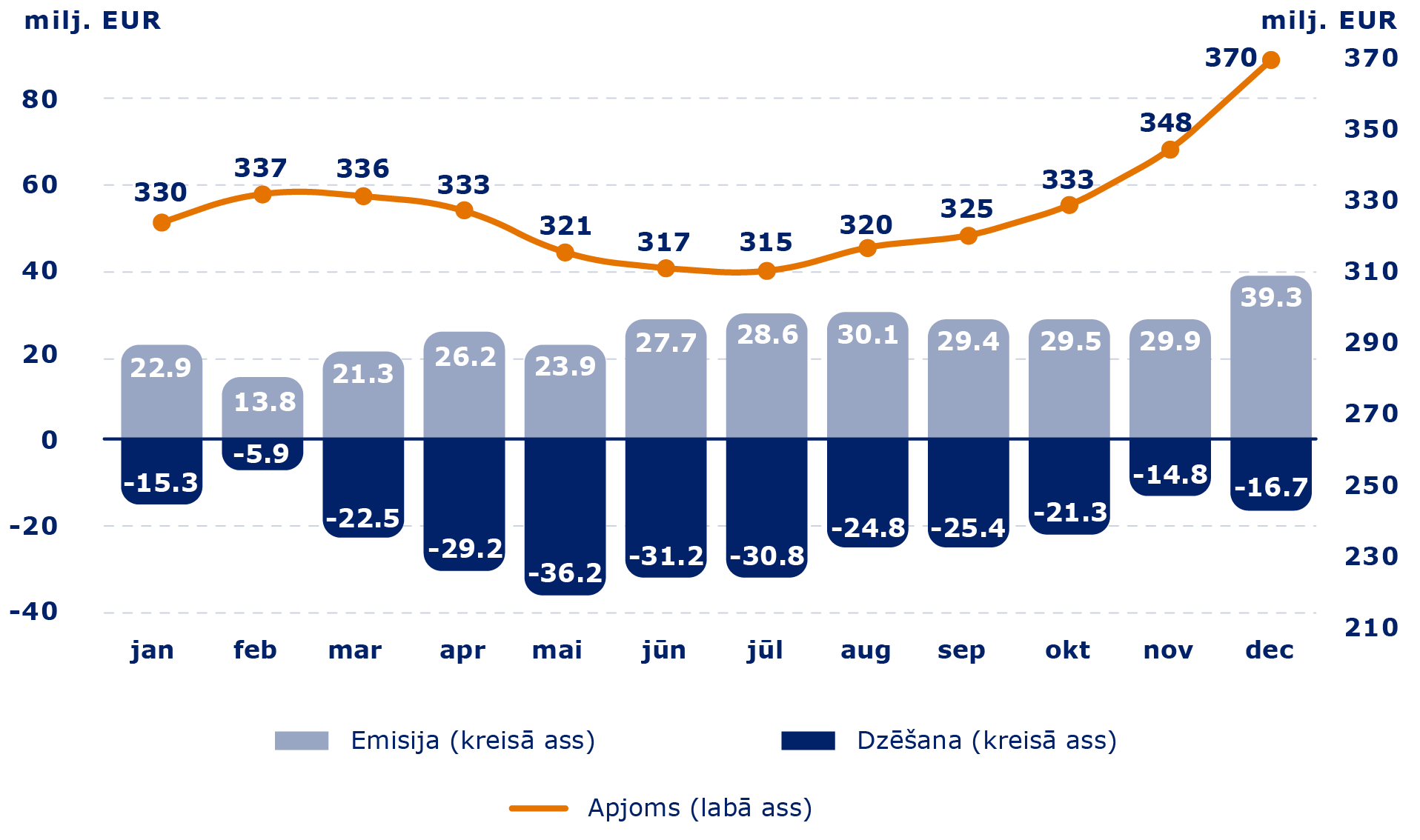 Latvijas iedzīvotāju īpašumā esošais krājobligāciju apjoms 2025. gada beigās sasniedza 370 milj. EUR, gada laikā palielinoties par aptuveni 48 milj. EUR. Krājobligāciju emisijas apjoms 2025. gadā sasniedza 323 milj. EUR, ievērojami pārsniedzot dzēsto krājobligāciju apjomu (274 milj. EUR), un ieguldītāju skaits gada beigās tuvojās 7900.